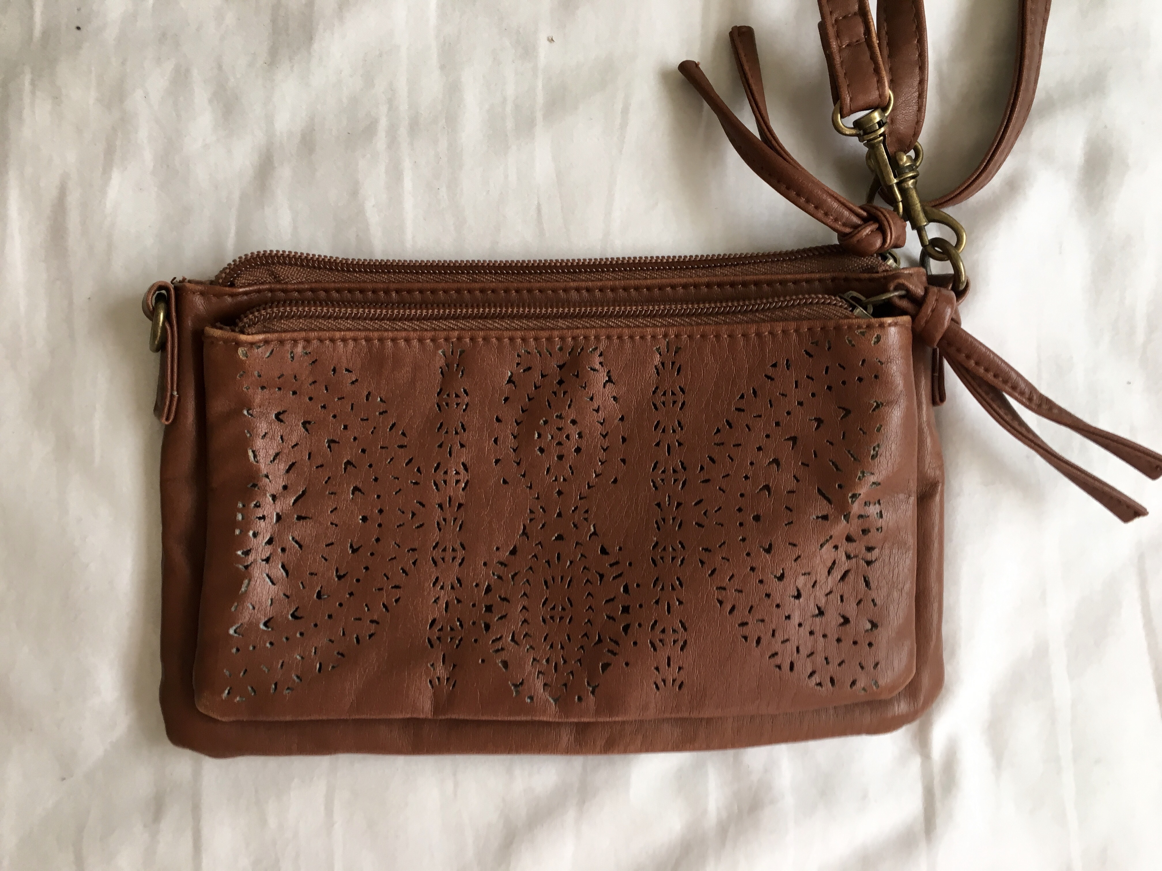 Brand new brown shoulder bag with separate zippered compartments and perforated design detail.